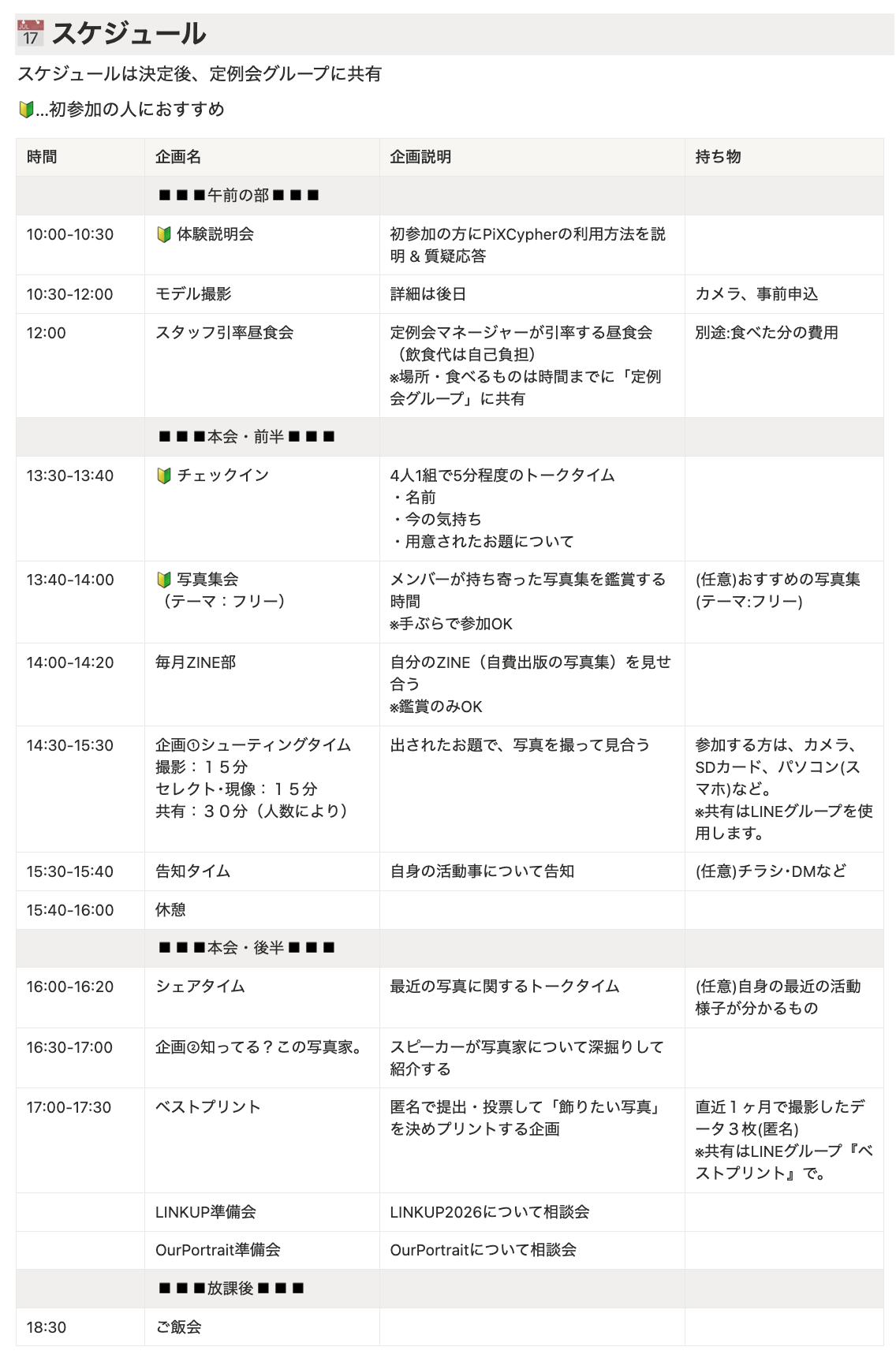 | 🔰 写真集会(テーマ:) | メンバーが持ち寄った写真集を鑑賞する時間 ※手ぶらで参加OK | |